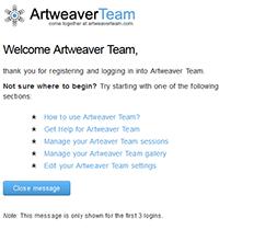 - For all new users there is a welcome message shown for the first 3 logins to help them getting started with Artweaver Team. Besides some links to the help, settings and the manage page there is also a new help article which describes how to use Artweaver Team.